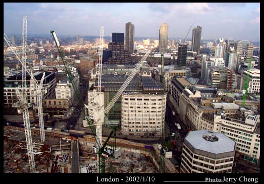 花了5磅,費了好大功夫登上著名的「聖.保羅大教堂」最高處,果然,我的感覺沒錯,從高處俯瞰下的倫敦就像是個超級大工地(如圖)輕易可見駭人的大型吊車、鋼架。即使沒有施工的地區也好不到哪裡,一棟棟看來摩登新穎的大樓擠在一塊,雜亂無章的實撐不上是美&&
