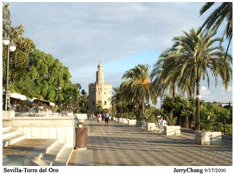 慢慢走到河邊,天空中的雲層有些厚,聳立在河邊的是回教時期的一座藏寶庫與監獄,由於最上頭鋪的是金色的瓷磚,故名「金塔」Torre del Oro(如圖),金塔旁沿著河岸有一條寬闊的行人步道,不少人在此慢跑、騎單車;岸邊停靠著一、二艘大型遊挺,有一票「老老」的國外旅行團似乎正準備要登船。賣票的先生看到我問我要不要上船,我搖著手婉拒,趁著年輕、時間多,我情願慢慢的靠自己雙腿走路體會這難得的河岸風光。