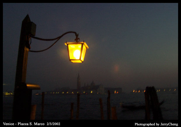 圖上的照片是我最喜愛的一張(感謝高人指點),趁著夜色來臨時,從聖馬可廣場邊,隔著大運河可以隱約看到教堂(S. Giorigio) 顯露出的華麗身影,在昏黃的燈影與茫茫大海上,呈現的是威尼斯含蓄而迷濛的夜色。