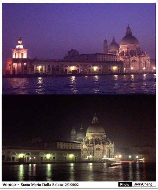註:圖上是聖馬可廣上對岸(左前方)的聖塔瑪麗亞撒路帖教堂(Santa maria della Salute),是一棟白色的巴洛克式教堂,在夜晚格外華麗、高雅,最適合格外觀賞;教堂的建造是為了感念1630年黑死病的侵襲,也有人取其Salute,「健康」之意,譯成安康之母教堂。