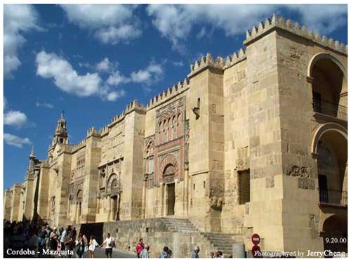 到了西班牙,看到了這座龐大的「巨無霸」級清真寺,真是張大了嘴半天說不出話來。依我估計,光繞著圍牆走一圈大概就要花上三、四十分鐘以上了。而據資料顯示,這座大清真寺竟可容納2萬5千人,試問,台北有那座建築物可容納這麼多人的呢?真是了不起!有些可惜的是,在13世紀時,中央部份被基督徒修改為哥德式的主教堂(於16世紀完工),所以後來有些地方就有些回、西合併的味道了。