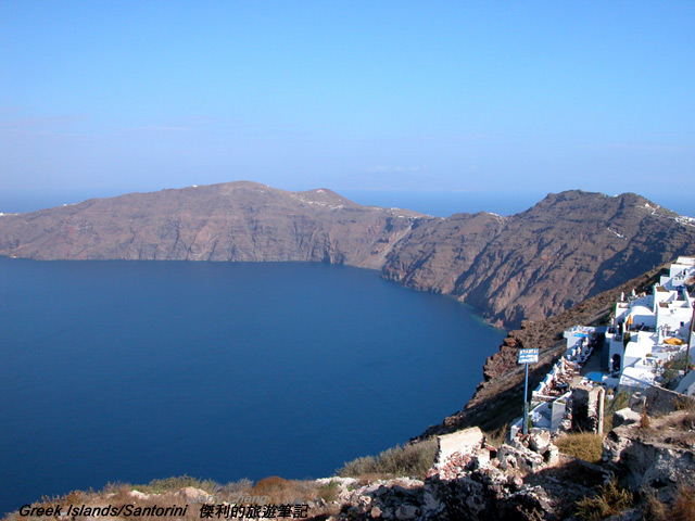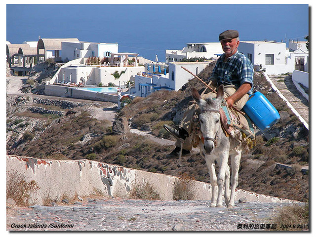 這條路上,最棒的是可以近距離的看到Santorini火山峭壁,非常壯觀,奇特,陡峭的插入海面。陽光下的海面非常漂亮,感覺像是片平靜無波的鏡子,反射天空的碧藍,讓人不由的一再駐足觀賞。而迎面而來的一位趕驢人,更讓我留下很有味道的作品。