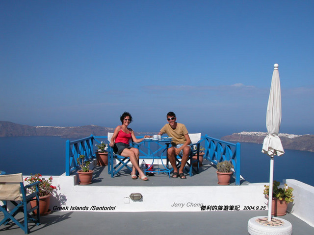 看這對美國來的朋友,多開心!右後方白色部分就是著名的Oia~