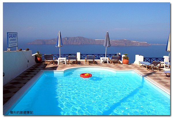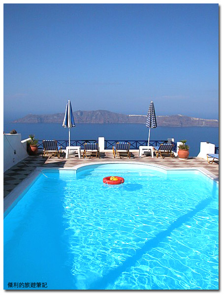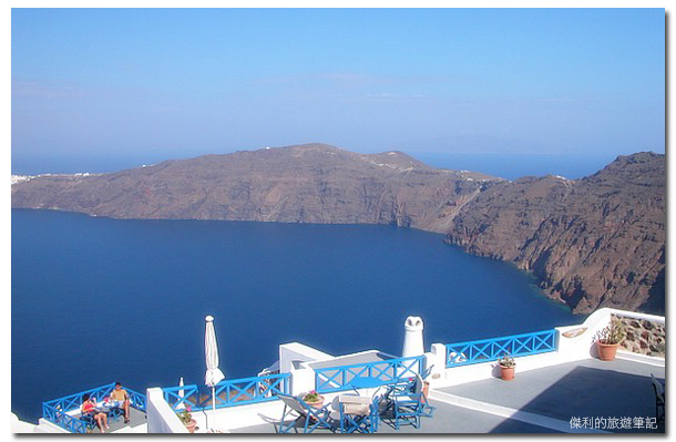 就像途中見到的一對美國來的情侶,正在面海的陽台上享受美景,他們的位置很棒,整個陽台感覺上像是延伸到海面上,而且附近剛好幾乎沒有其他鄰居,非常安靜,可以單獨享受Santorini最靜謐的一角。