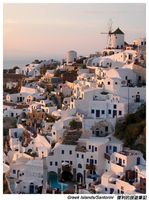沿著火山崖峭壁所建造起來的Oia山城可說是鬼斧神工,很難想像竟有人可以在峭壁上蓋出密密麻麻的美麗房子,不過,裡頭交錯曲折的小路超乎想像的錯綜複雜,在不見老婆的時候,更像是迷宮般不易辨識方向,轉了幾個彎,臉臭到不行的馬蘭達終於找到,要不是寶貝相機肩負著紀錄「世界最美麗夕陽」的神聖使命,可能早被老婆丟到海中了~