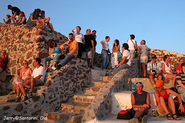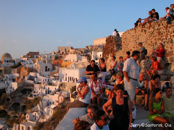 時間一分一秒的繼續走,所有人都像是被催眠般,往近日落的方向移動,不久,我們再度與喬治、愛菲重逢,此時,所有人開始尋找最佳的位置跟視野了。而我則按照「我的心遺留在愛琴海」的Justin所描述,朝向北邊的一處平台移動,聽說那裡是最有名的看夕陽地點。
